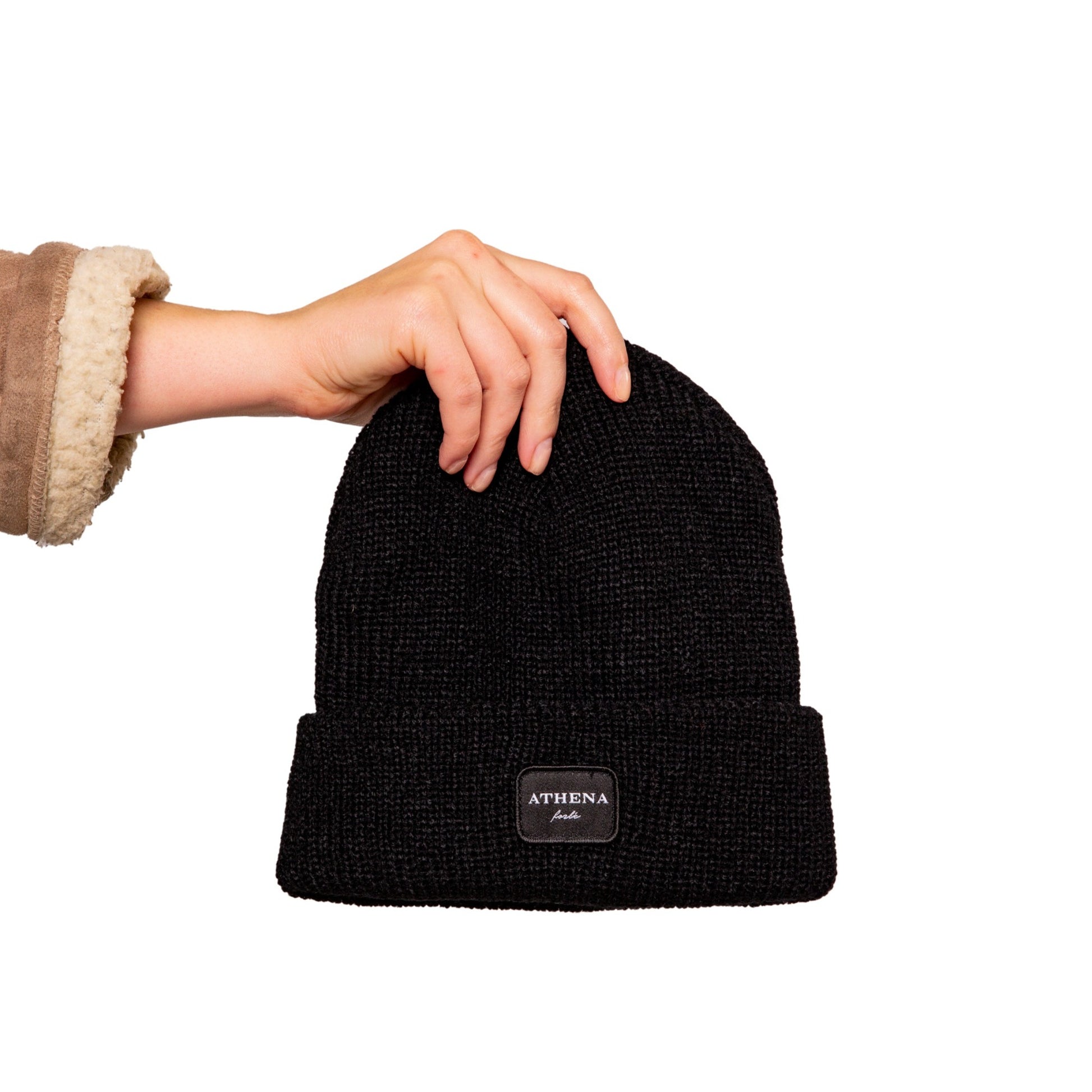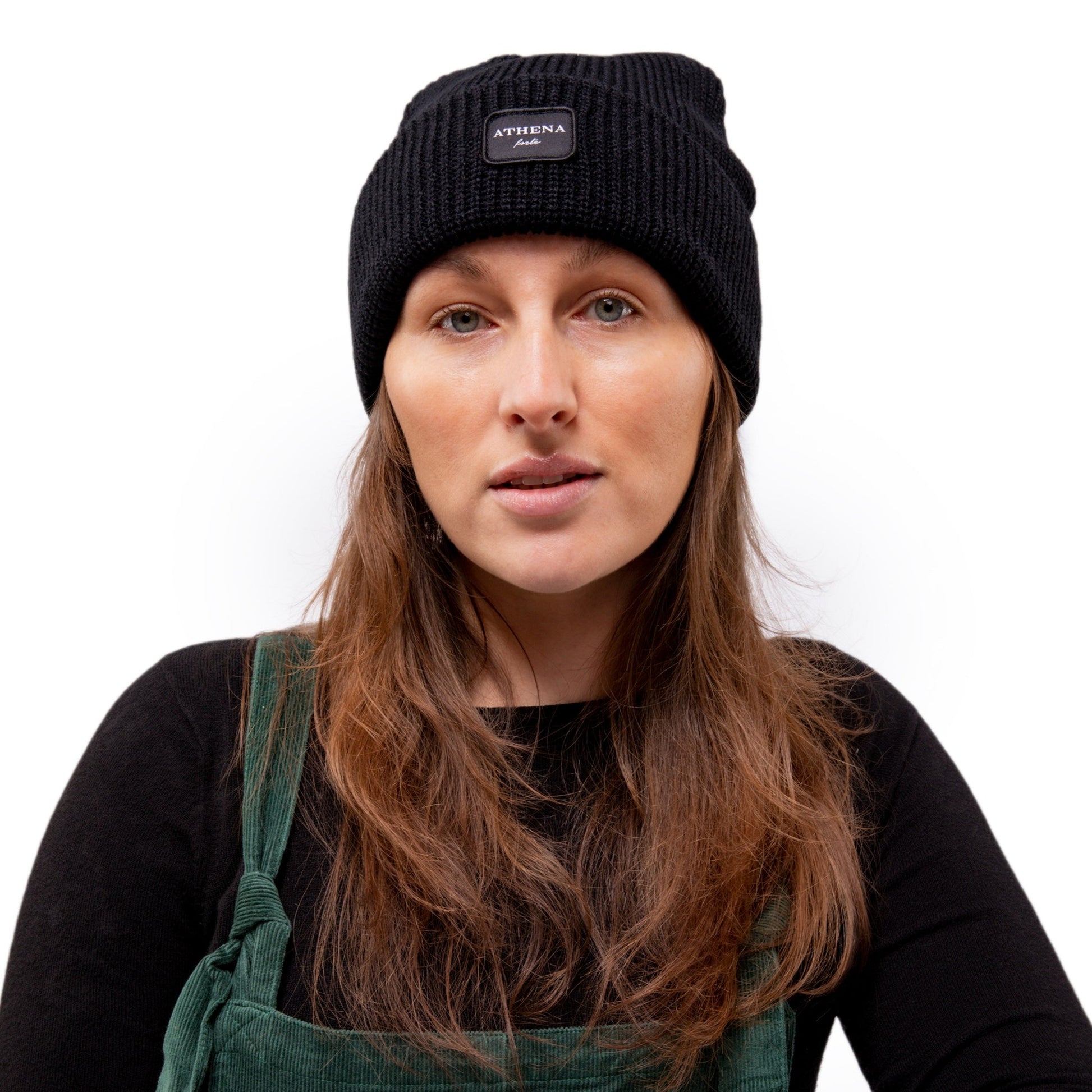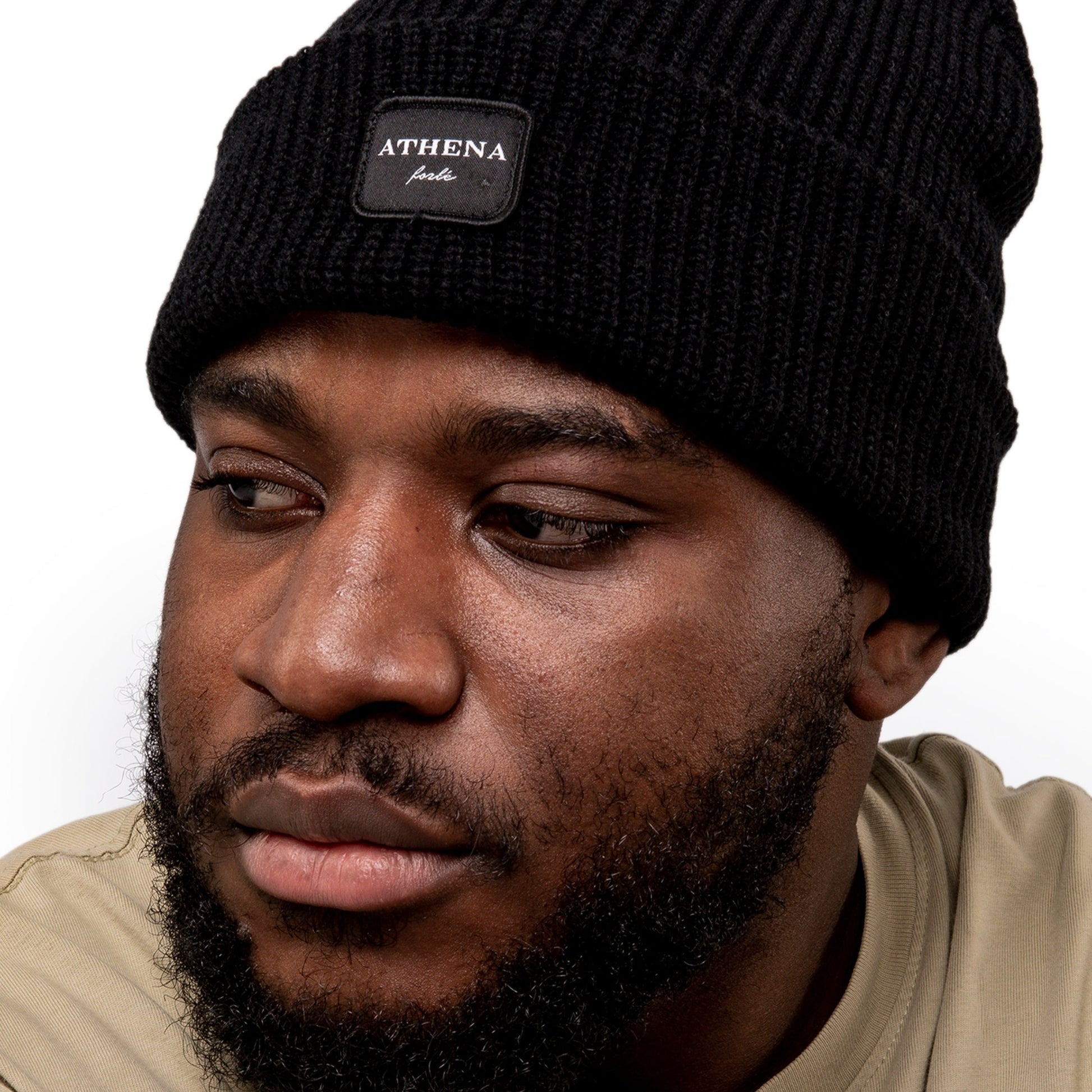 Black ribbed beanie featuring the distinctive Athena Forté logo and emblem. This is fashion with a purpose - for each beanie you buy we will donate the equivalent to a person in need.