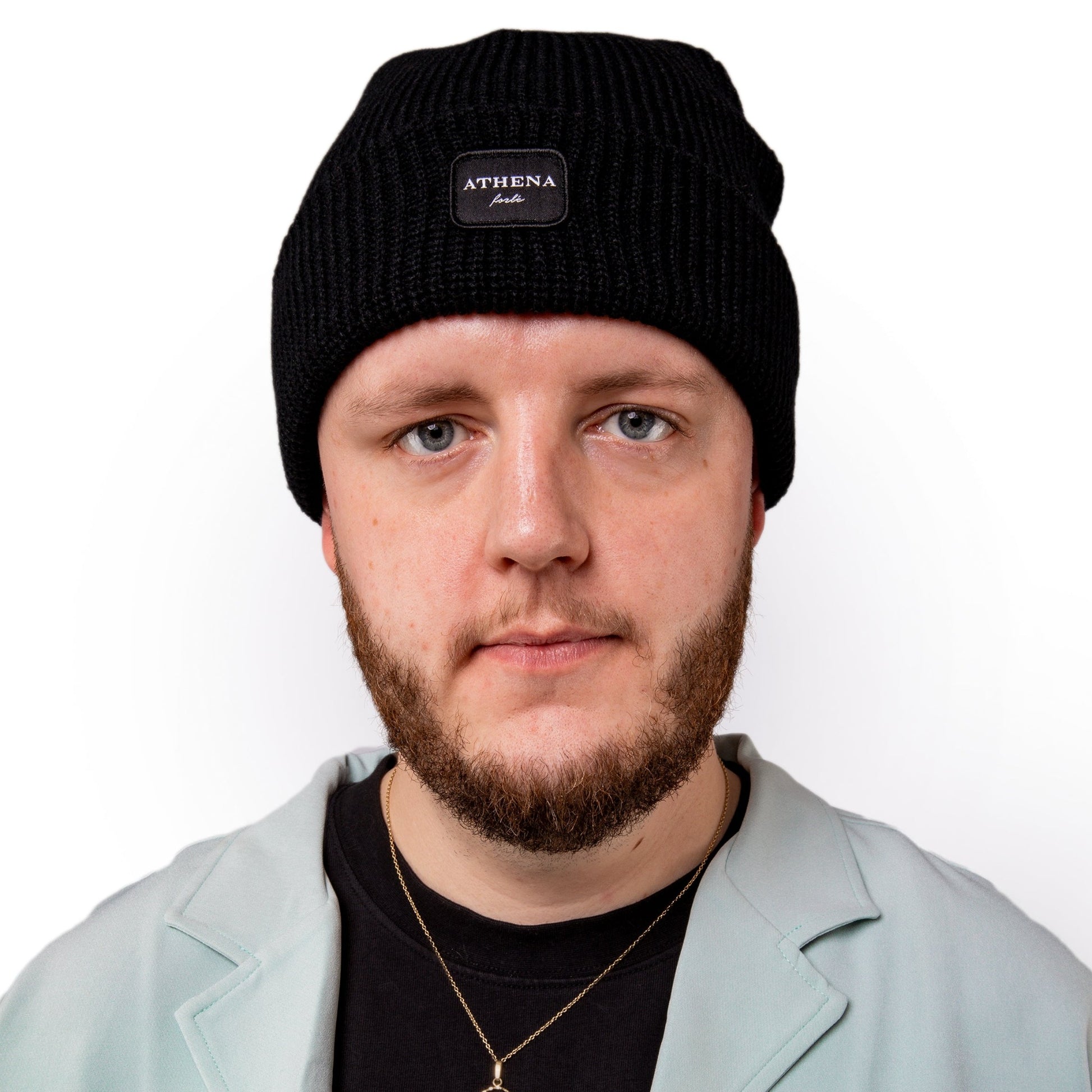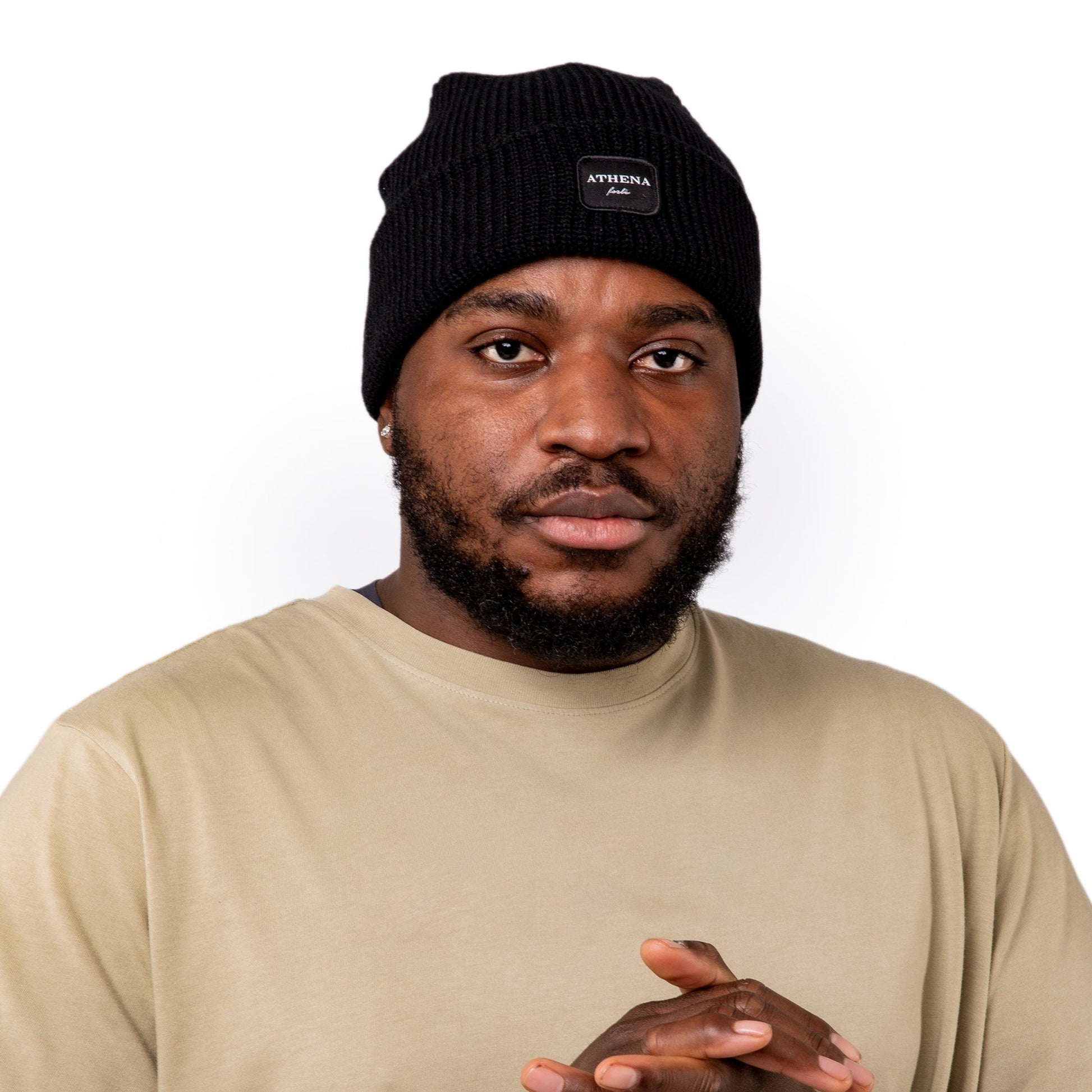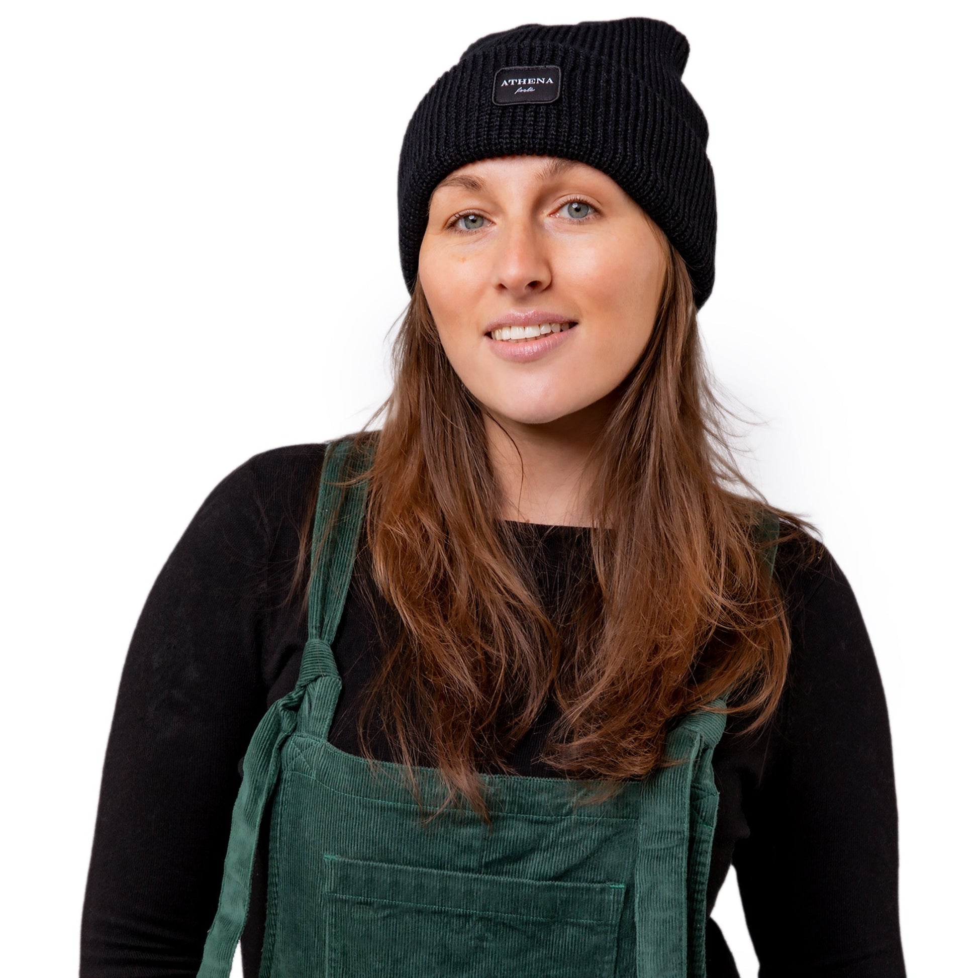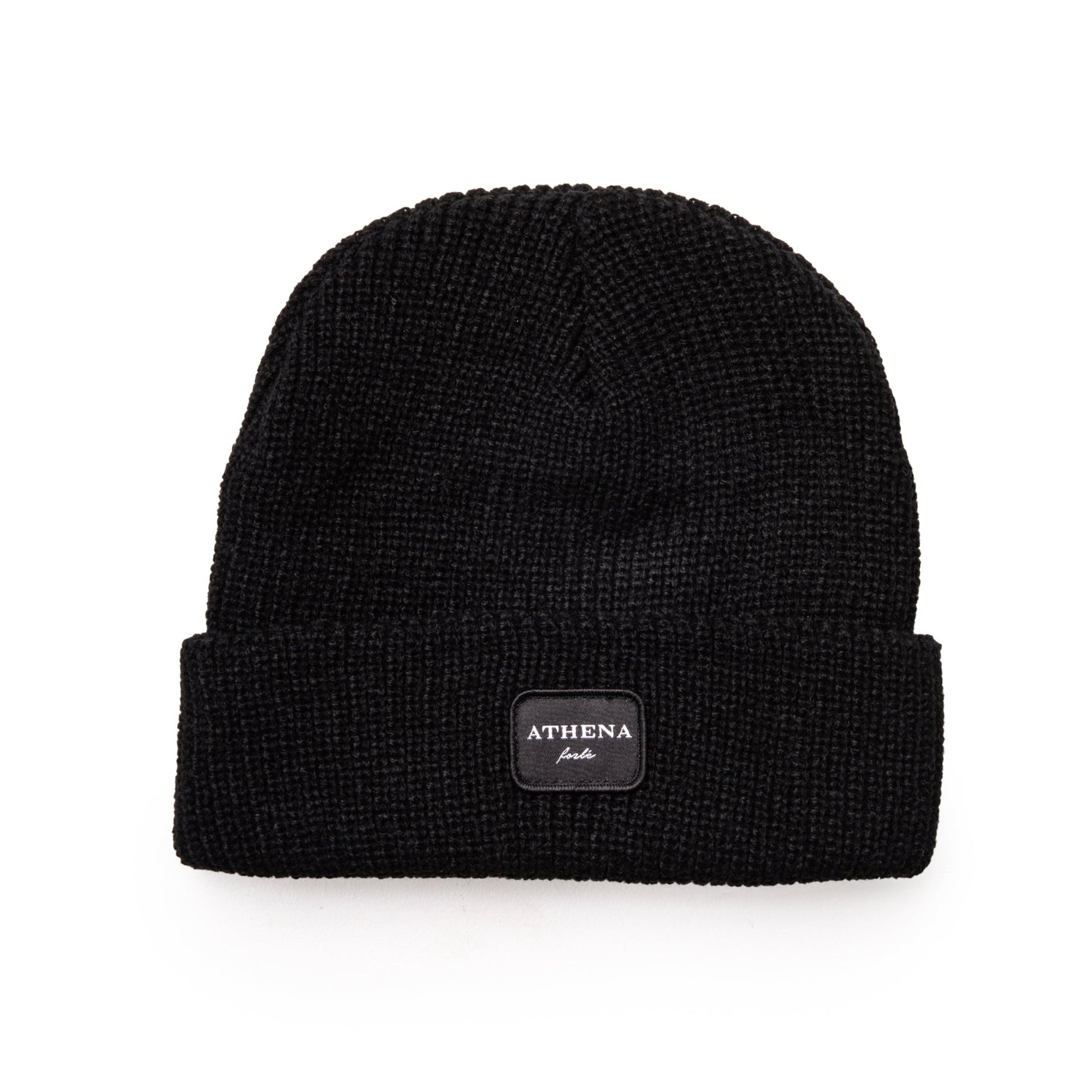 Black ribbed beanie featuring the distinctive Athena Forté logo and emblem. This is fashion with a purpose - for each beanie you buy we will donate the equivalent to a person in need.